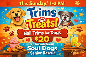 Join us for an afternoon of fresh nail trims and sweet treats at Legion Dog & Cat Supply! Paws and Reflect is offering $20 nail trims for dogs, and every dollar raised will go directly to support Soul Dogs Senior Rescue and the incredible work they do for senior pups in need.